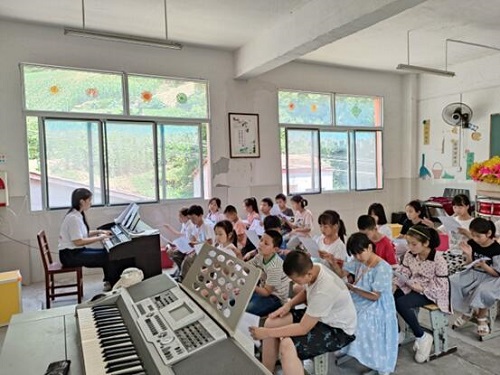 本網訊(通訊員 呂偉鵬)鄉村振興,教育先行。通過幾天的支教,志愿者老師們了解到了向壩中小學缺乏音、體、美等專業藝術教育資源后,漢江師范學院暑期“童心童行”助力鄉村振興社會實踐小分隊的隊員和指導老師于2023年7月5日前往十堰市竹溪縣向壩村中學小學進行支教,為充分挖掘孩子們的潛力,彌補一定的藝術教育資源缺口,此次支教隊員特開設了諸多特色藝術課程。
