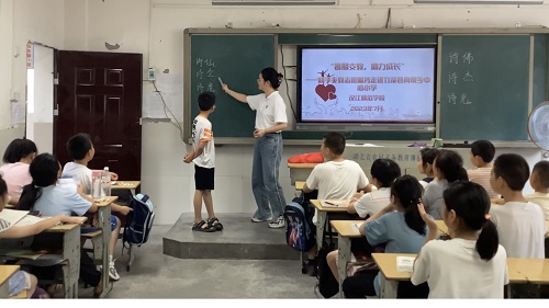 7月10日,為展現詩詞魅力,培養學生對詩詞文化的興趣,傳承國學經典,弘揚中華優秀傳統文化,漢江師范學院“童心童行”助力鄉村振興社會實踐小分隊在湖北省十堰市竹溪縣向壩鄉中心小學開展了一場精彩絕倫的詩詞小比賽。實踐隊員話音未落,一雙雙小手齊齊高舉,比賽的帷幕在一道道稚嫩的“老師,我來!”中緩緩拉開。學生爭相舉手,有的甚至都站起來了,比賽進行的十分激烈。“下一個‘詩魔’的詩!”,“《大林寺桃花》唐·白居易,人間四月芳菲盡,山寺桃花始盛開……”。