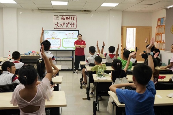 2023年7月8日下午,湖南工商大學前沿交叉學院“三下鄉”暑期社會實踐隊-HUTB護苗成長隊聯合長沙市天心區文源社區以“兒童普法先行,助力健康成長”為題展教育關愛志愿活動。活動圍繞反詐、反校園霸凌,開展了一堂生動有趣的科普課堂。