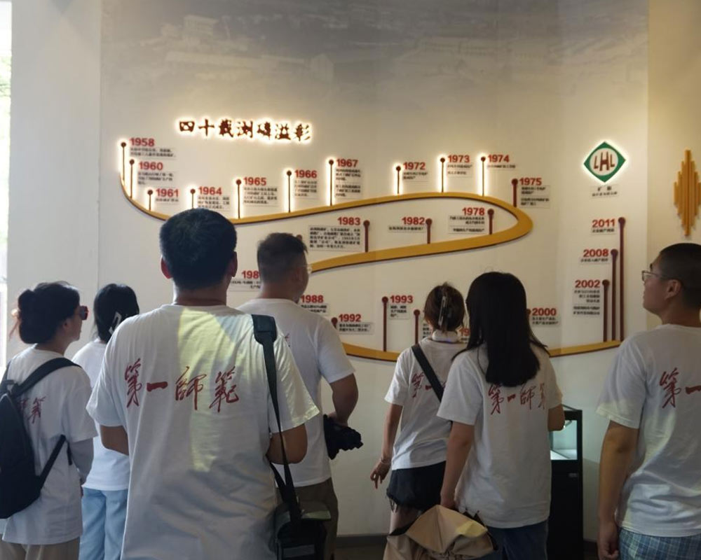 同學們在歷史陳列館參觀瀏陽磷礦四十多年發展歷史時間線