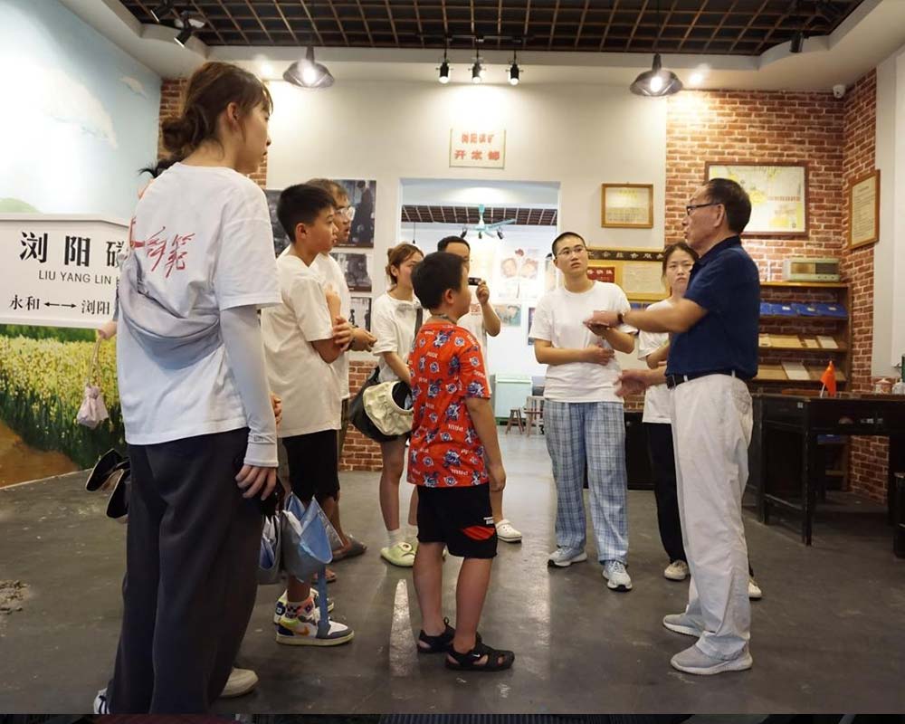 張慶生老先生在給湖南第一師范學院美術與設計學院藝術服務團的同學們講述幾十年前瀏陽磷礦產業歷史