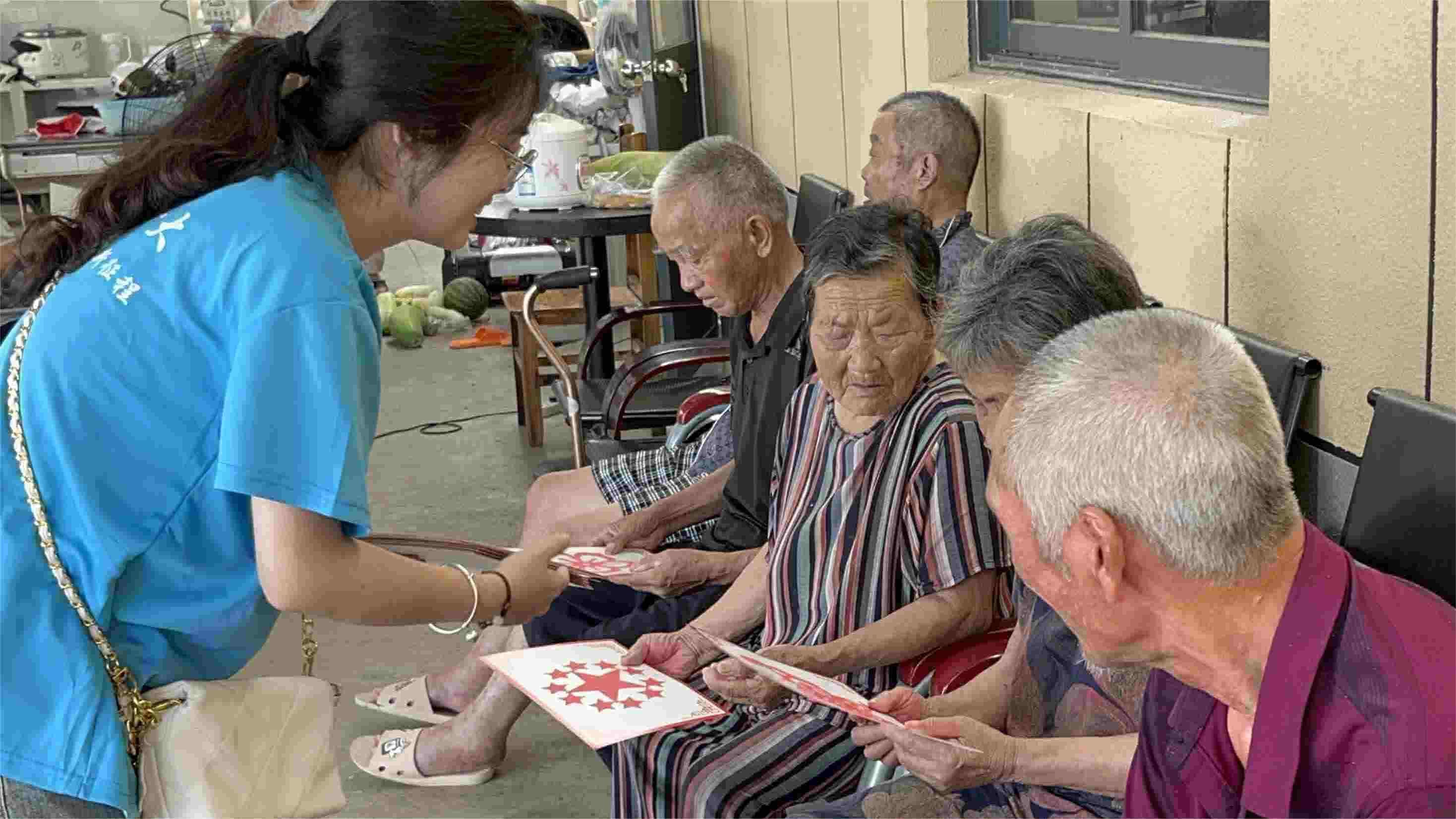 下午,一場暴雨過后,郎溪縣西郊村養老服務中心的負責人將大家分批接至目的地,大家稍稍參觀了養老服務中心的環境之后,便開始嘗試和老人們溝通,首先介紹了我們的團隊,之后大家分別與老人們進行交流,詢問了一些日常生活問題,一些老人們跟我們說了一些關于他們的故事,聽完后大家心中感觸頗深。接著我們同老人們進行了一些娛樂活動,在大家的共同努力下,院子里洋溢著歡聲笑語。最后我們給老人們分發介紹了剪紙,并且作為禮物給老人們留念,最后大家一起留影紀念。整個過程中成員們和老人們都相處的很融洽,我們心中也有許多難以言喻的感受,這次機會讓我們明白了要更加珍惜與家人們相處的時光,更應該多陪伴身邊的親人。