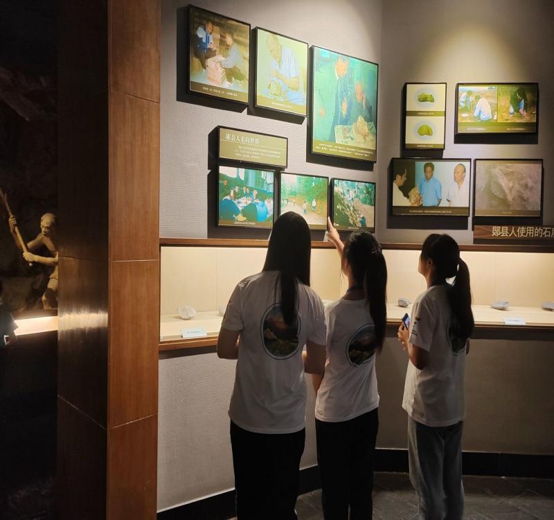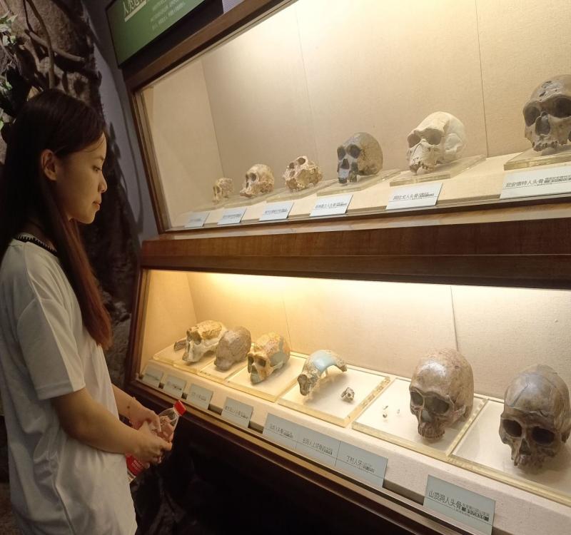 實踐隊員繼續向展廳深處走,看見了擺放的頭骨。屬于直立人階段的有鄖縣人、鄖縣梅鋪人、鄖西白龍洞人;屬于早期智人階段的有鄖西黃龍洞人。