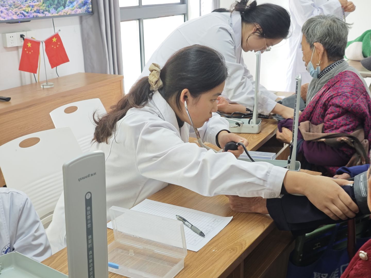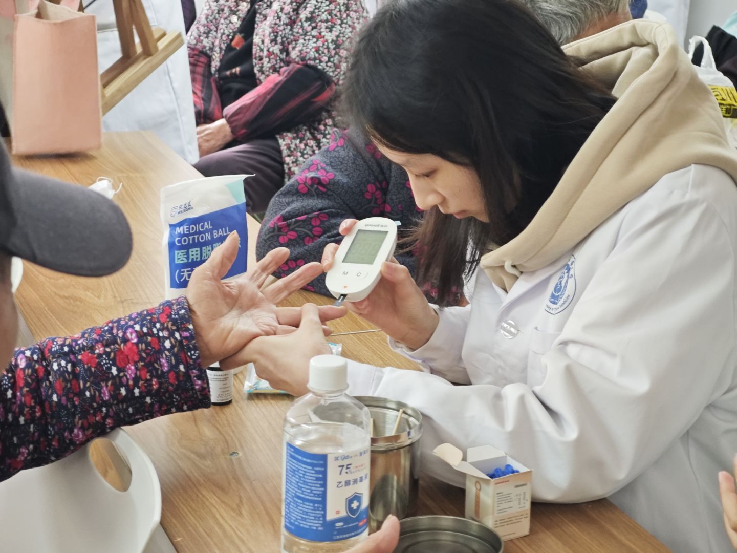 活動現場,推拿區志愿者們提前準備好推拿用的推拿布,防止在按摩時讓老人感到不適。按摩區志愿者以小魚際,大魚際,一指禪等手法去按摩老年人肩頸部位風池穴、肩井穴去緩解肩頸僵硬,還通俗講解穴位作用。測量區志愿者一邊細心地為老人測血壓、測血糖,一邊耐心記錄數據并給出健康建議。其次,我們還開展了預防三高的宣講活動,我們從中醫“治未病”理念入手,用通俗的語言講解高血壓、高血糖、高血脂的中醫成因,還結合季節特點,分享了飲食調理(如芹菜、山楂等食材的養生用法)、穴位按摩、八段錦簡易動作等預防“三高”的實用妙招