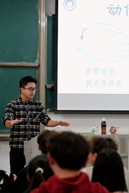 本次培訓由學社經驗豐富的學姐擔任主講。培訓中,學姐結合PPT課件,從“動作要領”與“操作步驟”兩大維度展開教學:先詳解“沉肩垂肘、松腕、手呈疊瓦狀”的基礎姿態,再聚焦小魚際滾法的核心技巧——包括“雙腳丁步站立”的發力站姿、“前臂帶動腕關節驅動”的動力方式,以及“滾三回一(力度比3:1)、緊滾慢移”的操作細節,同時明確了手法頻率需控制在每分鐘120-160次。