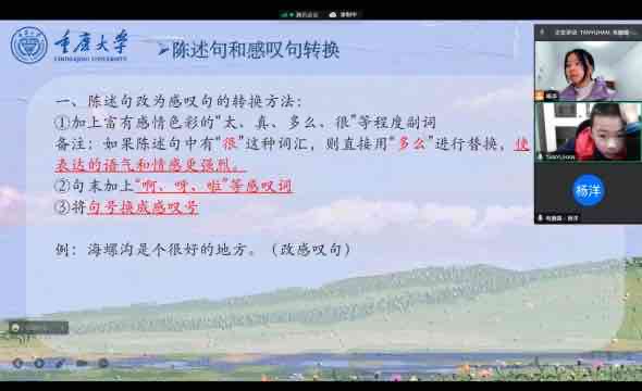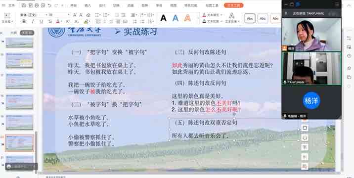 2023年1月14日,重慶大學志愿者楊洋參與了“一起云支教”線上志愿活動,她根據三年級小朋友自身學習的弱項,精心準備了“句式轉換”的語文課程,課程內容主要分為句式改寫前測、技巧訓練、后測三個部分,小朋友與志愿者講師積極互動,課堂氛圍活躍。