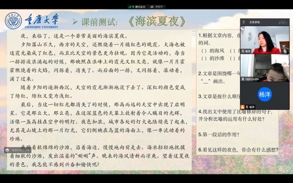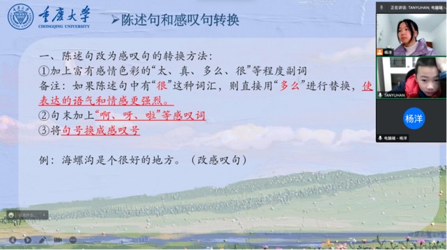 2023年1月14日至1月20日,重慶大學志愿者楊洋參與了“一起云支教”線上志愿活動。在此次公益送教活動中,楊洋對接到了正在上三年級的譚裕瀚弟弟,楊洋根據小朋友自身學習的弱項,精心準備了“句式轉換”、“閱讀理解”“語文寫作”三大主題的語文課程,除此之外,還為小朋友講解了“空氣污染”專題的課外趣味科普課程。第一次給弟弟上課時,弟弟活潑開朗的性格、積極主動的配合都給予了她莫大的勇氣和鼓勵,消除了由于不熟悉而帶來的緊張感。每一堂課,