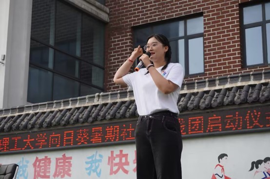接著“向日葵”暑期社會(huì)實(shí)踐團(tuán)負(fù)責(zé)人田雨代表全體實(shí)踐團(tuán)成員進(jìn)行發(fā)言,田雨表示非常有幸再次來到八一愛民學(xué)校進(jìn)行支教活動(dòng)。去年受疫情影響,支教活動(dòng)轉(zhuǎn)為線上進(jìn)行。今年“向日葵”暑期社會(huì)實(shí)踐團(tuán)又重整旗鼓,來到了八一愛民學(xué)校進(jìn)行為期二十天的調(diào)研和支教活動(dòng)。“向日葵”暑期社會(huì)實(shí)踐團(tuán)將貫徹“服務(wù)社區(qū)、追尋紅色、傳承希望”的主題思想,通過一系列豐富多彩的課后服務(wù),開拓學(xué)生視野,培養(yǎng)集體主義、團(tuán)隊(duì)合作的精神,將紅色文化融入課堂,舉辦各類紅色活動(dòng),為孩子們帶來正確的思想引領(lǐng),讓孩子們感受紅色文化的魅力。