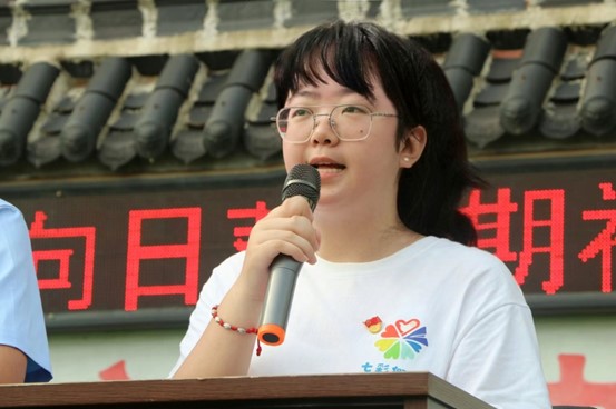 圖為““向日葵””暑期社會(huì)實(shí)踐團(tuán)負(fù)責(zé)人田雨發(fā)言
