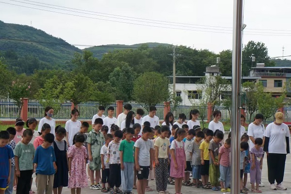 此次會議結束后,支教隊隨領導到洞泉小學舉行升旗儀式和“七七事變”默哀儀式。各班班主任組織同學們有序到操場排隊,由支教隊三名隊員進行升國旗并奏唱國歌,少先隊員敬隊禮其他成員行注目禮。結束后由志愿隊成員王啟鑫進行七七事變介紹講話,給小朋友們科普七七事變的相關事件,講話結束后帶領小朋友們和各位領導以及志愿隊全體成員進行默哀儀式。